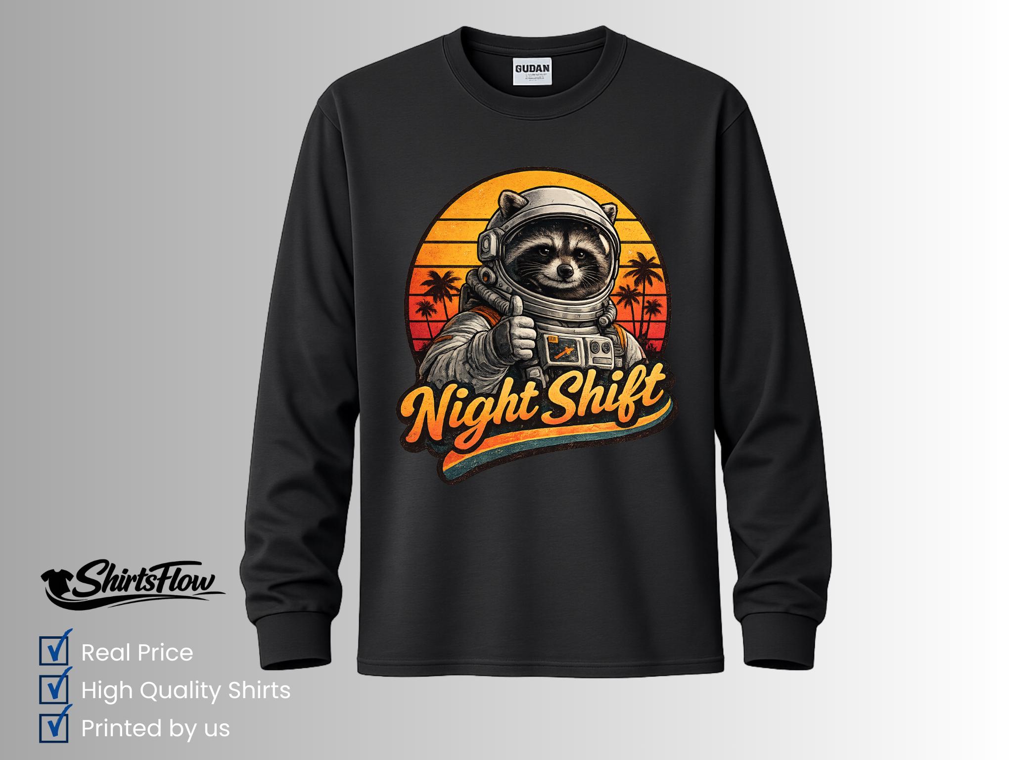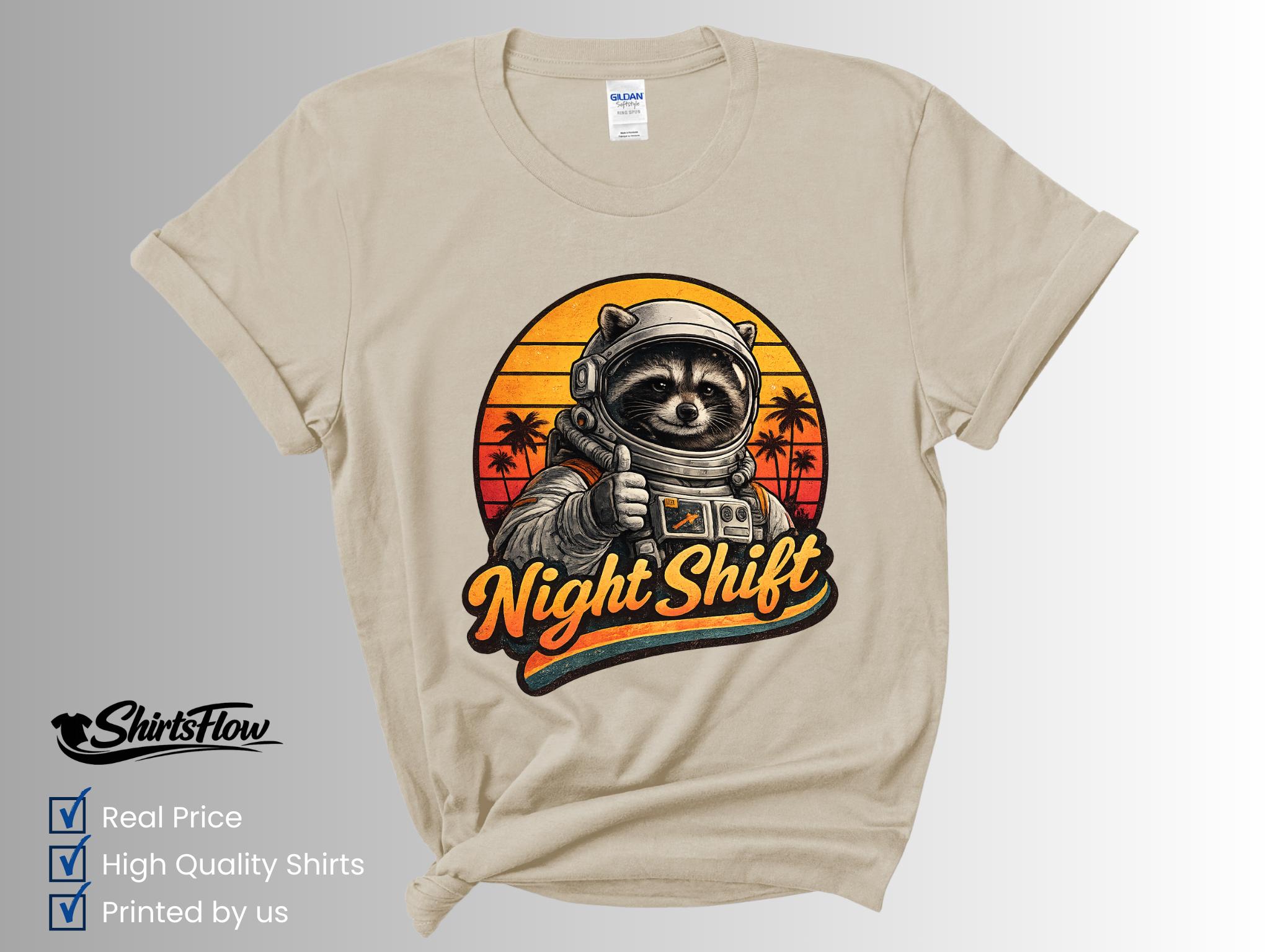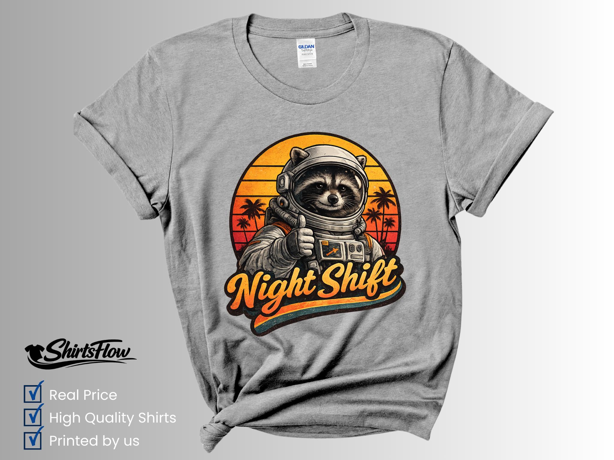 Bring a little cosmic humor to your designs with this retro astronaut raccoon graphic. This vintage-style illustration features a confident raccoon astronaut giving a thumbs-up in front of a warm retro sunset. The bold “Night Shift” lettering makes it perfect for anyone who works late hours, loves space, or appreciates playful sci-fi art.