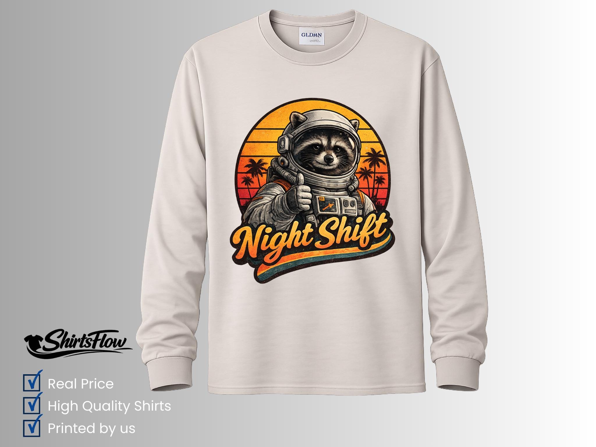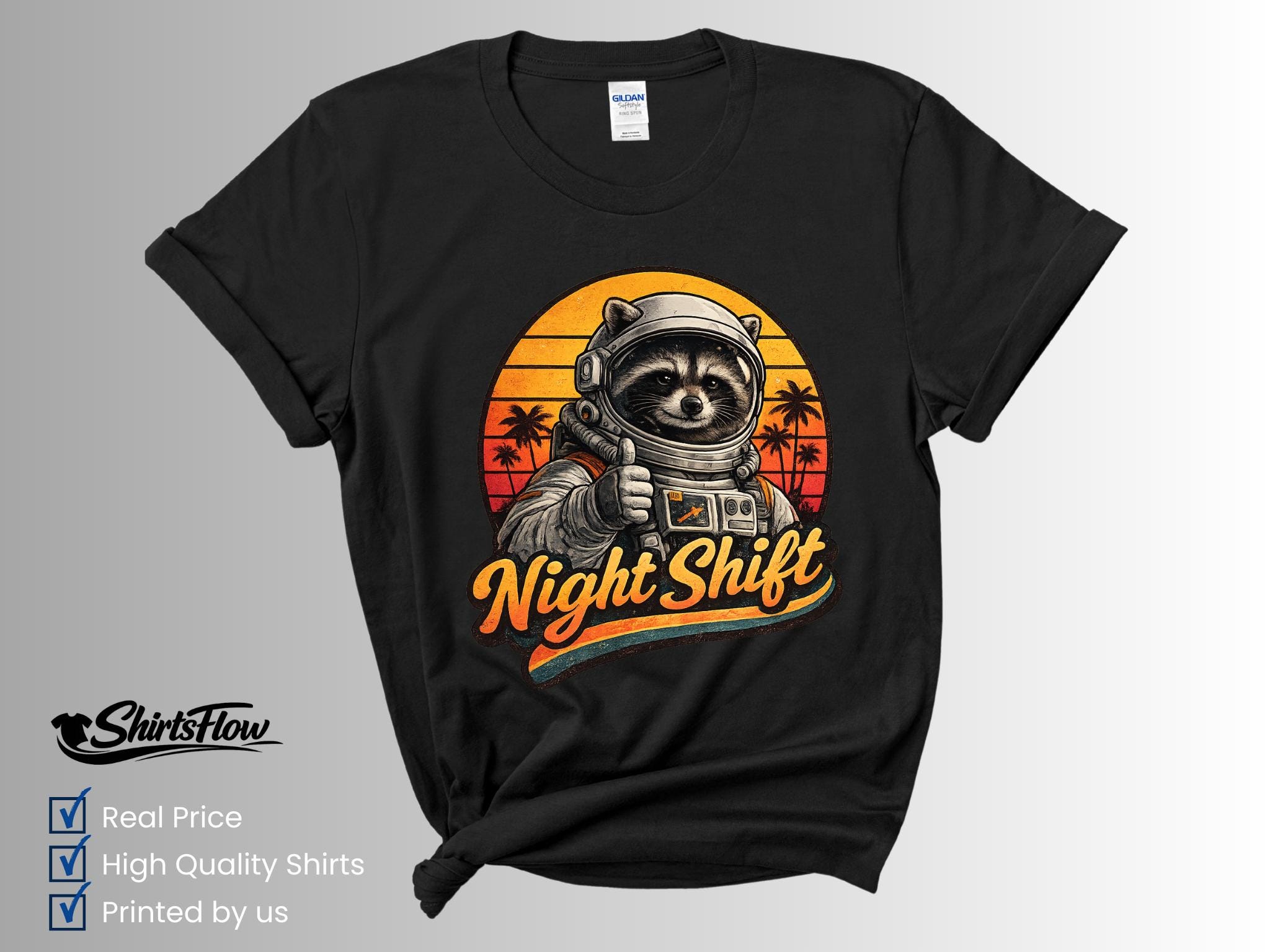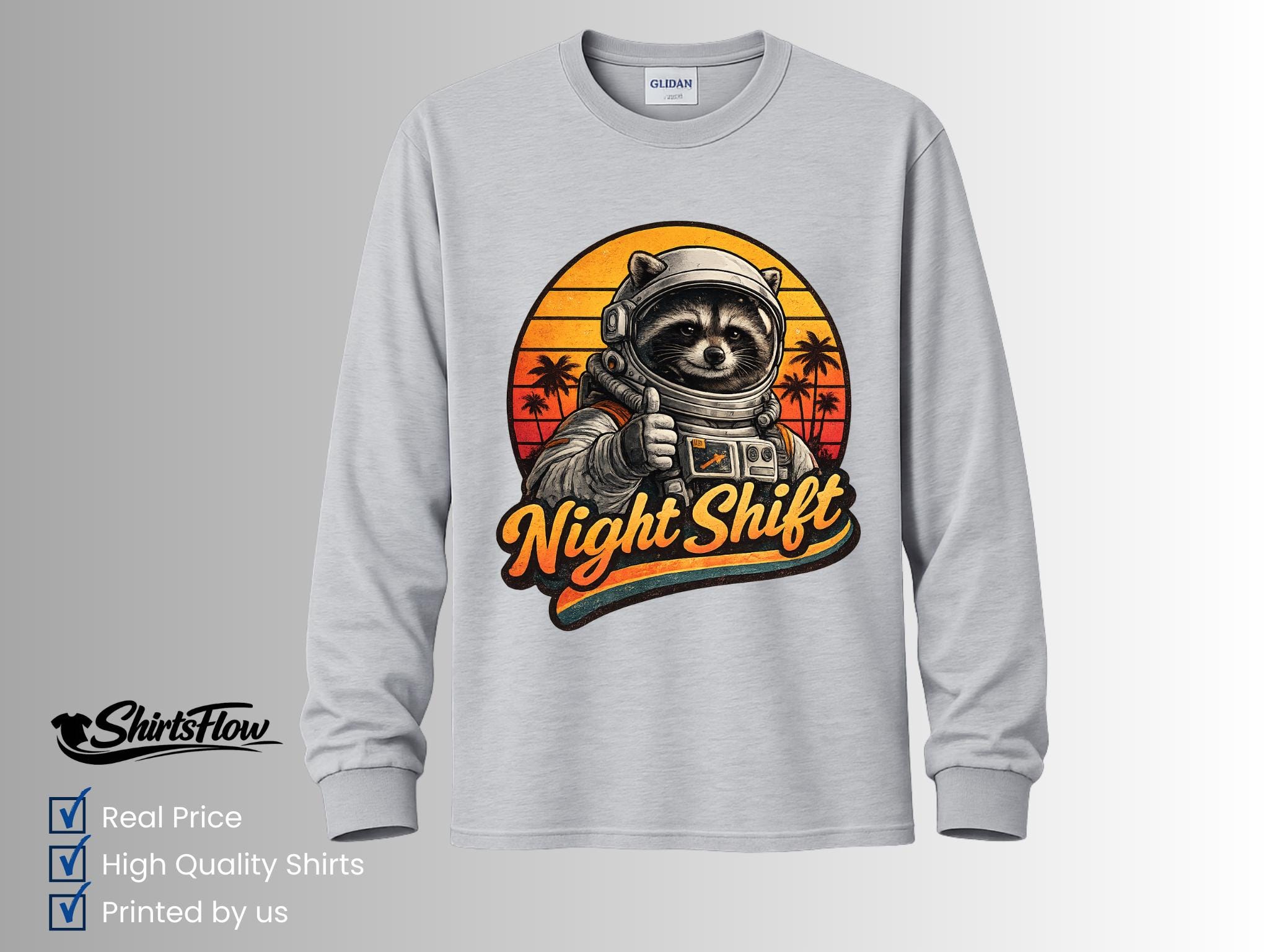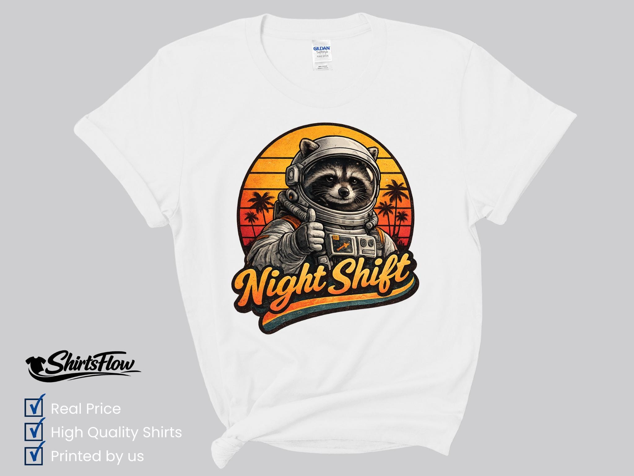 Bring a little cosmic humor to your designs with this retro astronaut raccoon graphic. This vintage-style illustration features a confident raccoon astronaut giving a thumbs-up in front of a warm retro sunset. The bold “Night Shift” lettering makes it perfect for anyone who works late hours, loves space, or appreciates playful sci-fi art.